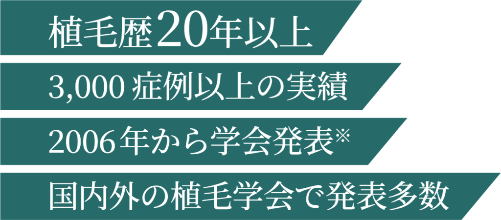 国際的に最も権威ある植毛学会、”International Society of Hair Restoration Surgery (ISHRS)” において、日本人で最も多い筆頭演者としての学会発表実績を有しています。(2025年時点)
