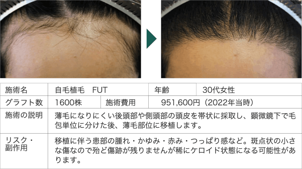 頭髪の状態は見た目年齢を左右することから、年齢を問わず女性の方からの植毛相談が増えてきました。 額まわりのヘアラインを植毛で整えることで、広いおでこを改善し、小顔効果にも期待がもてます。